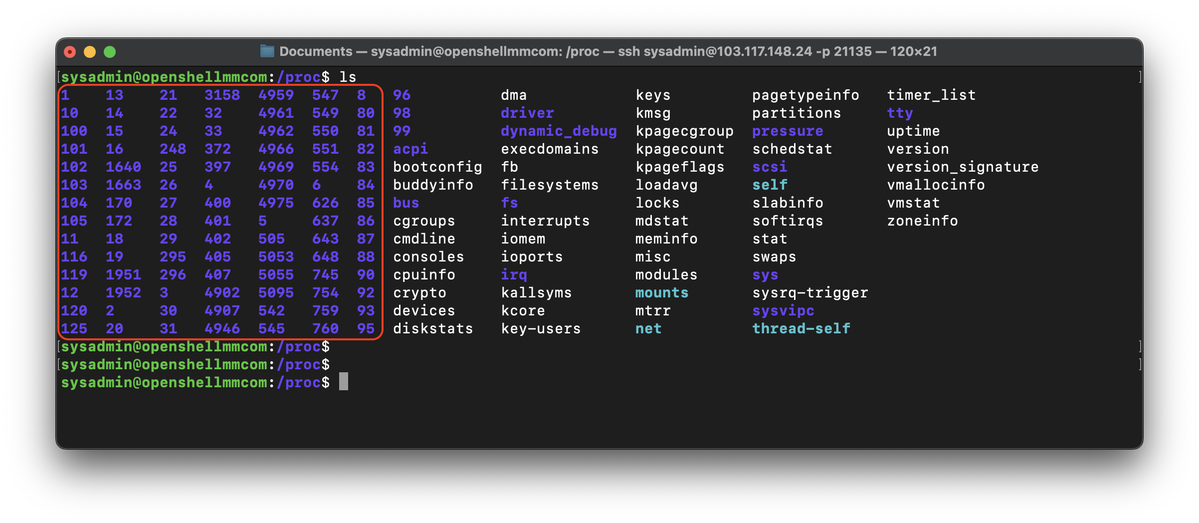 /proc/directory အောက်မှာ process id number နဲ့ directory တစ်ခု အတွင်းမှာ သိမ်းဆည်းမှာ ဖြစ်ပါတယ်။ - ဥပမာ