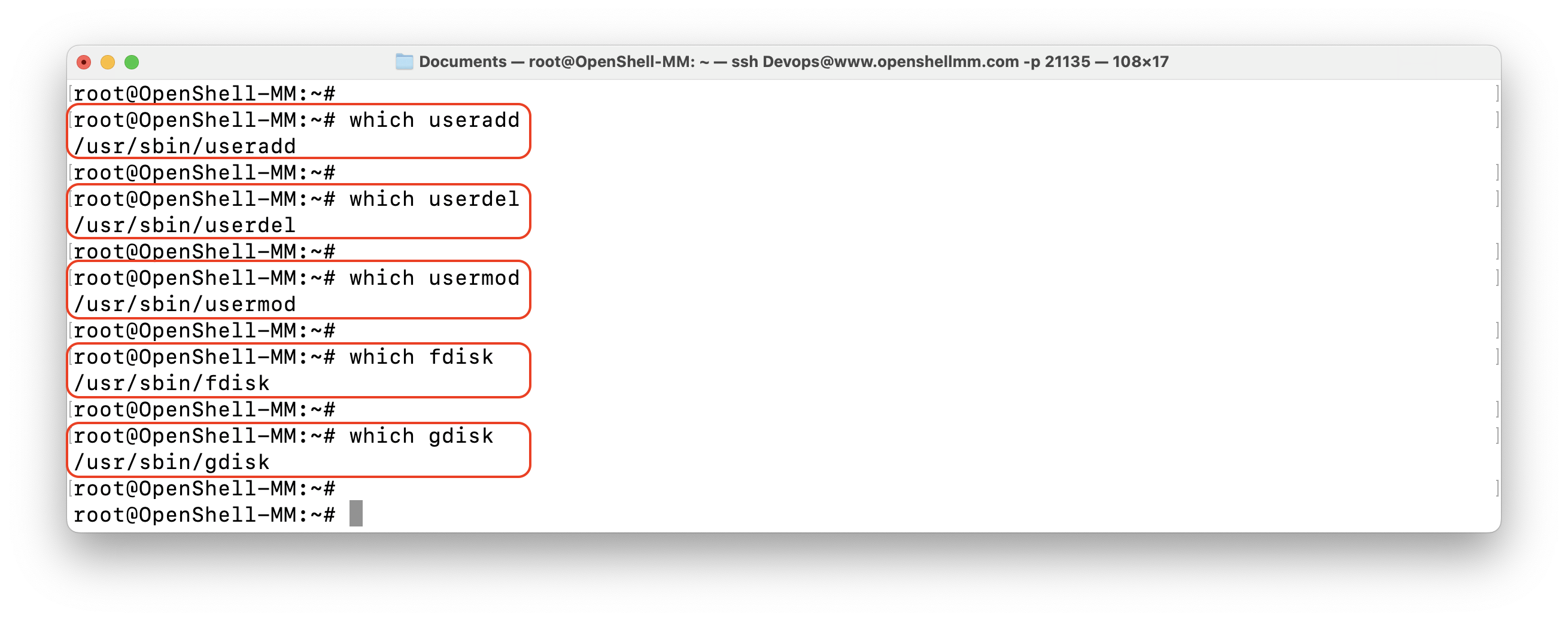 whichcommand ကို အသုံးပြုပြီး command (binaries ) တွေကို file system ပေါ်မှာ သိမ်းထားတဲ့ နေရာကို စစ်ကြည့်နိုင်ပါတယ်။ အသုံးပြုဖို့ရန် root privileges လိုအပ်တဲ့ command တွေ ဖြစ်တဲ့ အတွက်/usr/sbin/အောက်မှာ ရှိတာကို တွေ့ရမှာပါ။