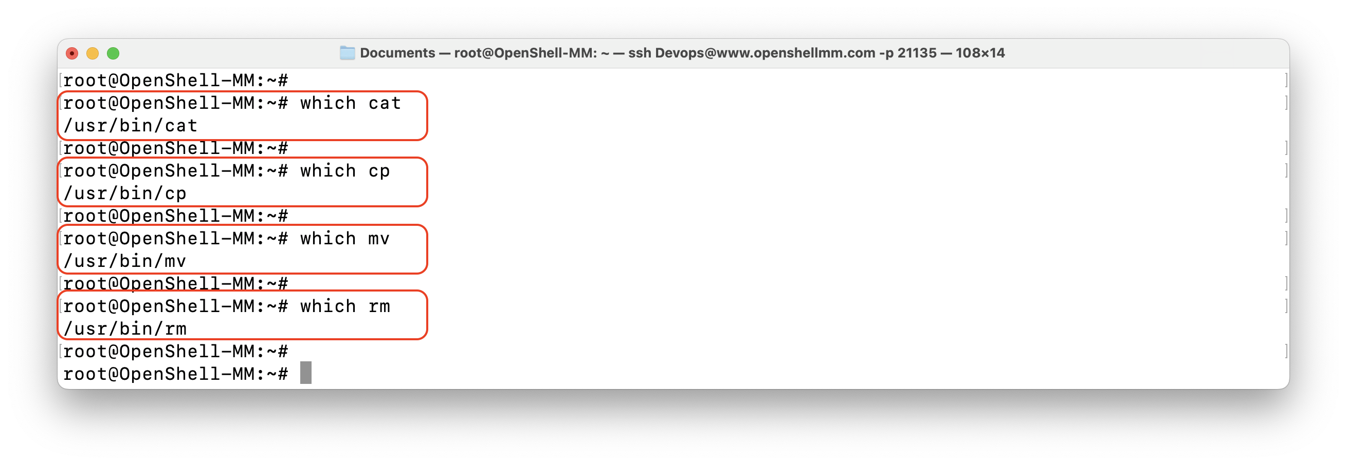 whichcommand ကိုအသုံးပြုပြီး commands တွေကို stored လုပ်ထားတဲ့ path လမ်းကြောင်းကို စစ်ပြထားပါတယ်။/usr/bin/အောက်မှာ သိမ်းတာ ဖြစ်ပါတယ်။