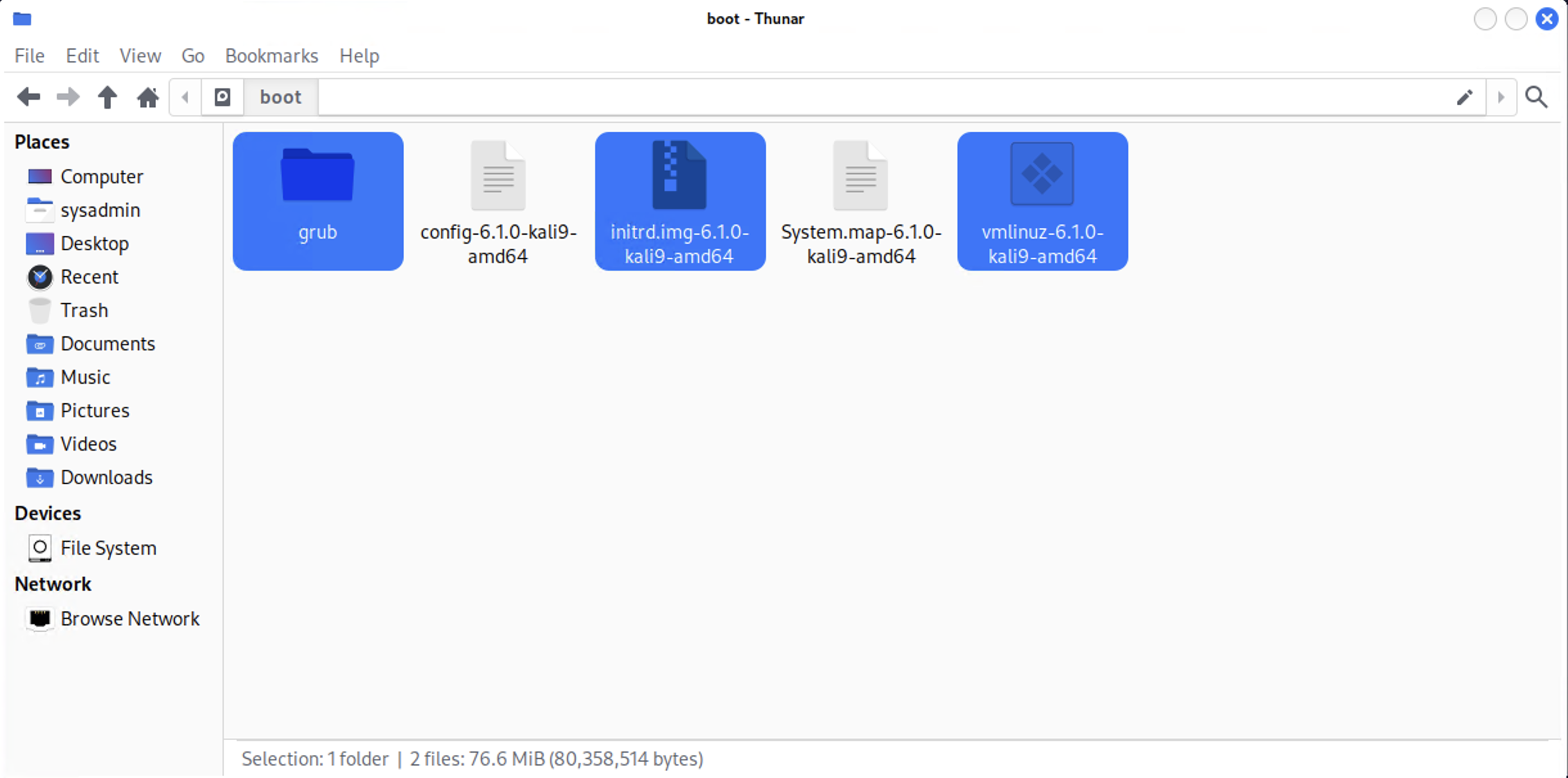 kali linuxရဲ့/boot/directory အောက်မှာ ရှိတဲ့ files တွေပြထားပါတယ်။ image name တွေနောက်မှာ version ပါတာကို တွေ့ရမှာ ဖြစ်ပါတယ်။