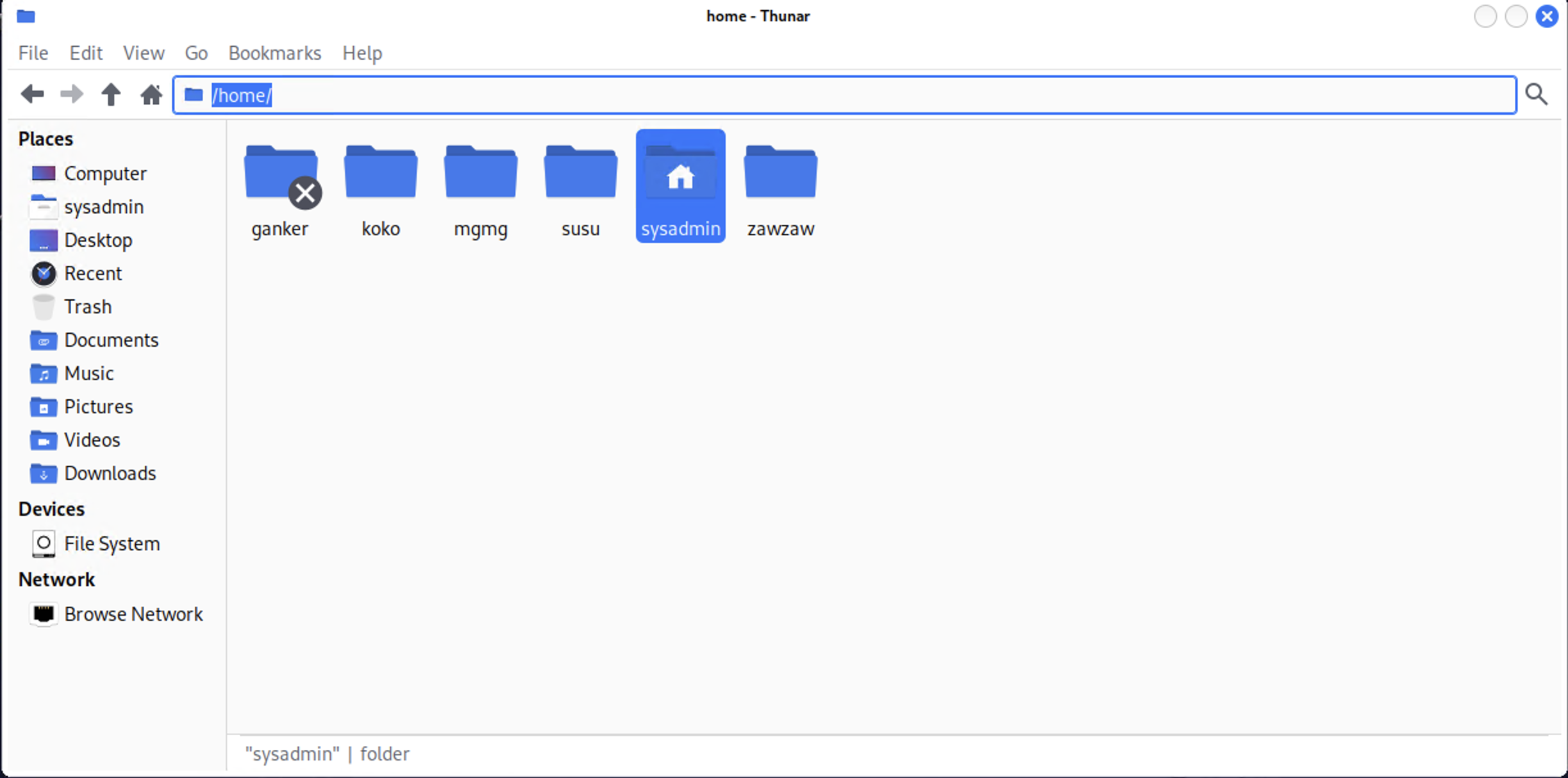 /home/directory ကို normal user account တစ်ခုချင်းစီရဲ့ home directory တွေကို isolated ဖြစ်ဖြစ် သိမ်းဖို့ရန်အတွက် အသုံးပြုတာ ဖြစ်ပါတယ်။/home/directory မှာဆိုရင် Linux System မှာ register ပြုလုပ်ထားတဲ့ user name နဲ့ home directory တစ်ခု ရှိနေမှာဖြစ်ပြီး ထို directory အထဲမှာဆိုရင် User အတွက် လိုအပ်တဲ့Desktop,Decuments,Downloads,Picturesအစရှိတဲ့ directories တွေ ရှိနေမှာ ဖြစ်ပါတယ်။