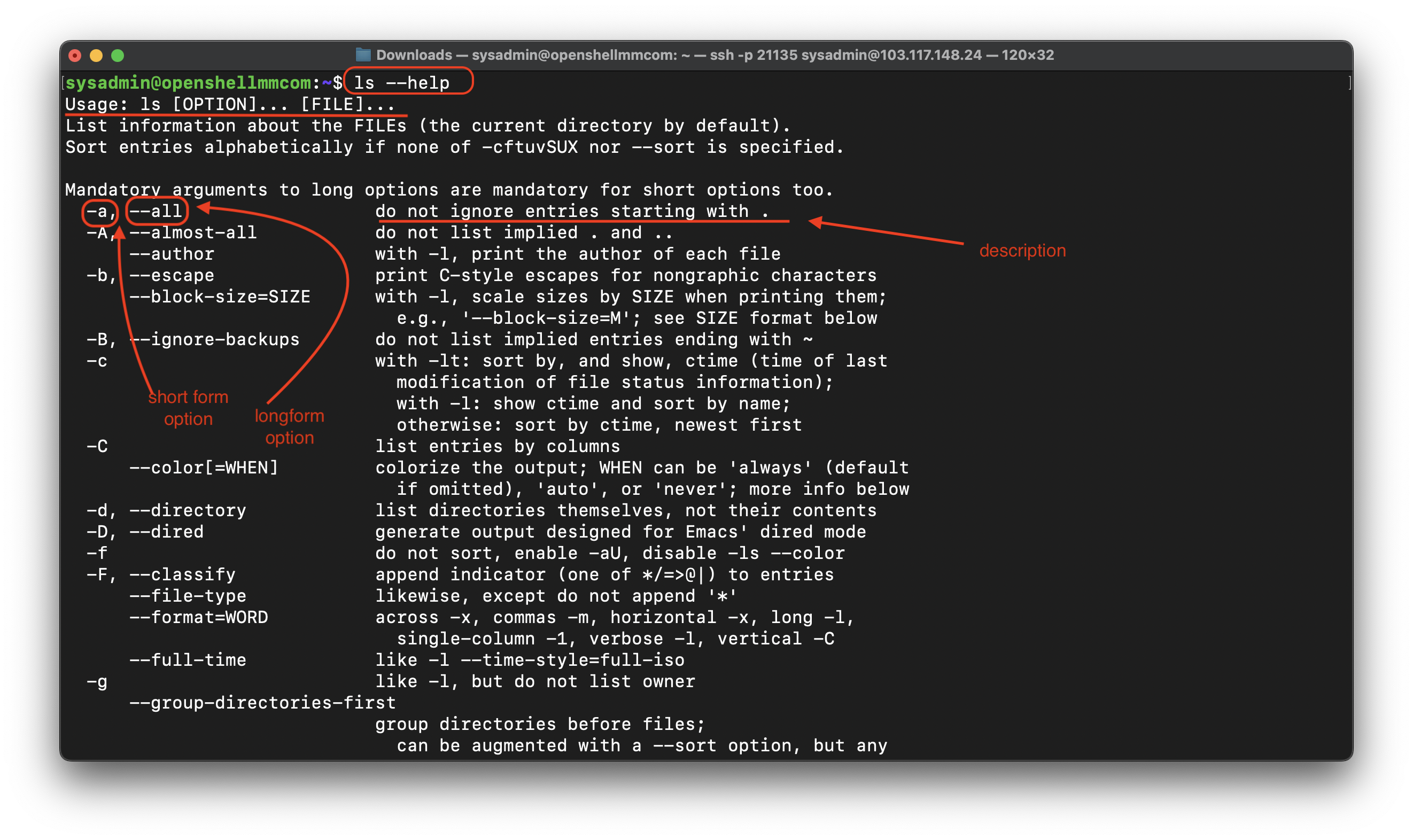 lscommand ရဲ့ အသုံးပြုပုံ usage ကို တွေ့ရမှာ ဖြစ်ပါတယ်။ - နောက်ပြီး option တွေကို ရေးသားတဲ့ အခါမှာလည်း short option နဲ့ long option ဆိုပြီး ရှိပါသေးတယ်။