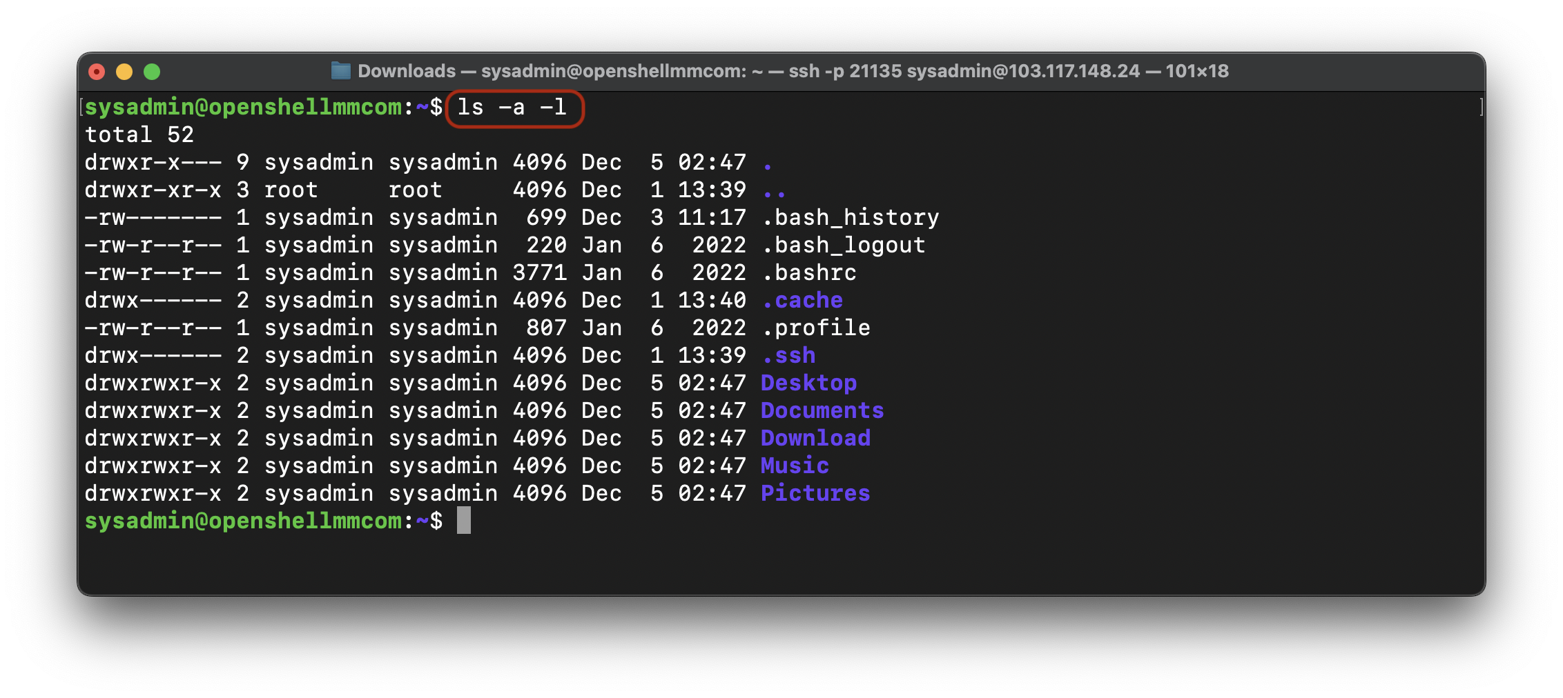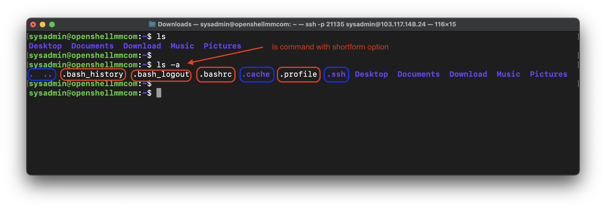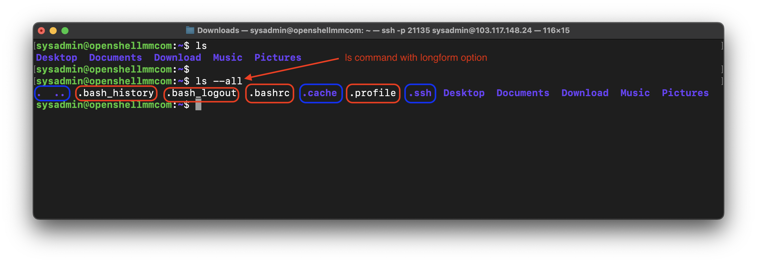 အထက်ပါ example မှာဆိုရင် အနီရောင် highlight သည် hidden file တွေဖြစ်ပြီး အပြာရောင် highlight သည် hidden directory တွေ ဖြစ်ကြပါတယ်။