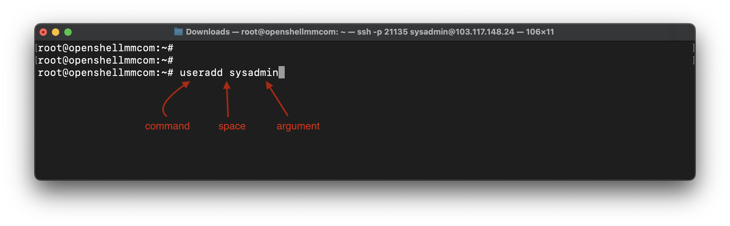 useraddcommand ကို အသုံးပြုရာမှာargumentမဖြစ်မနေ ပါဝင်ရပါမှာ ဖြစ်ပါတယ်။ - ကိုယ် တည်ဆောက်ချင်တဲ့ username တစ်နည်းအားဖြင့်