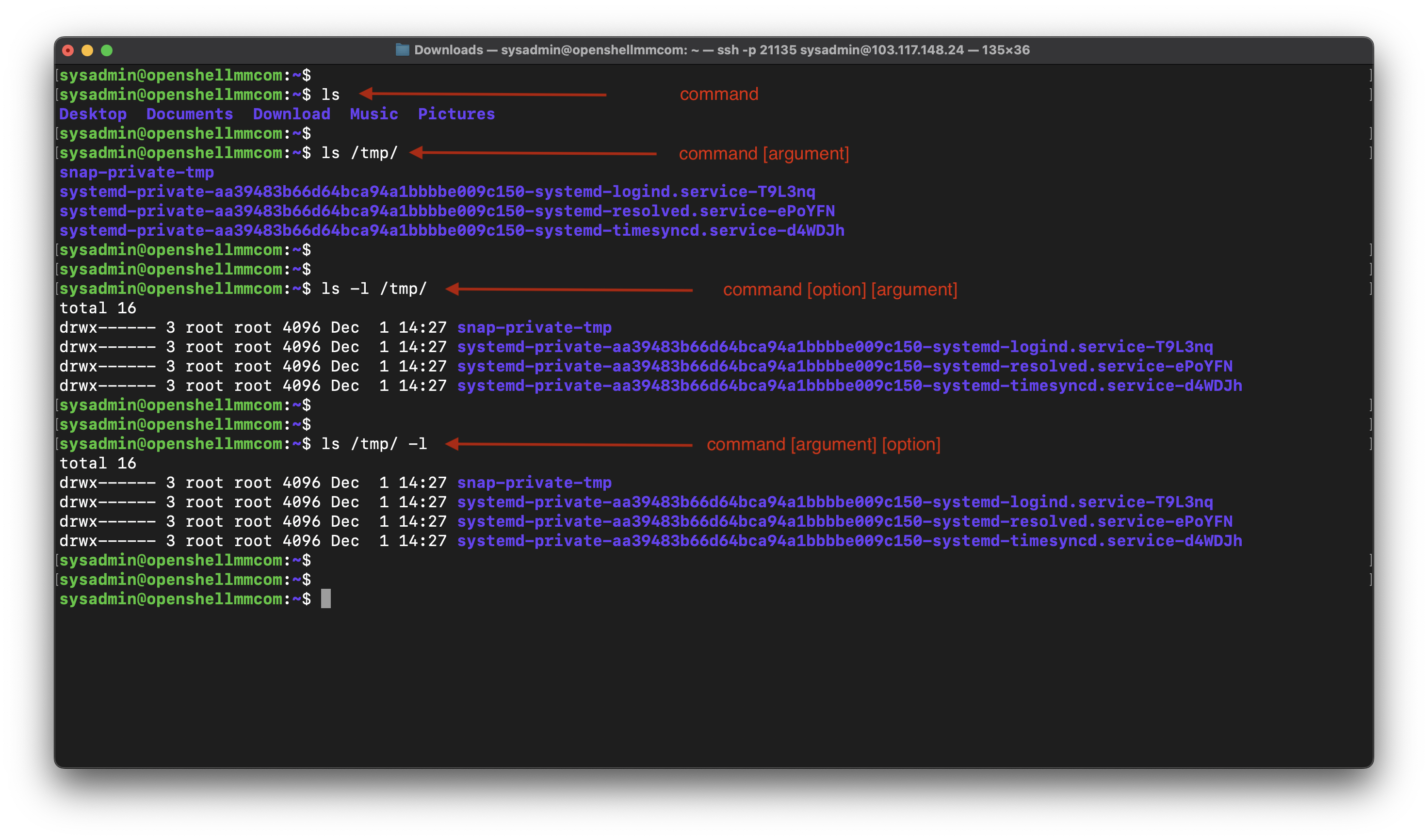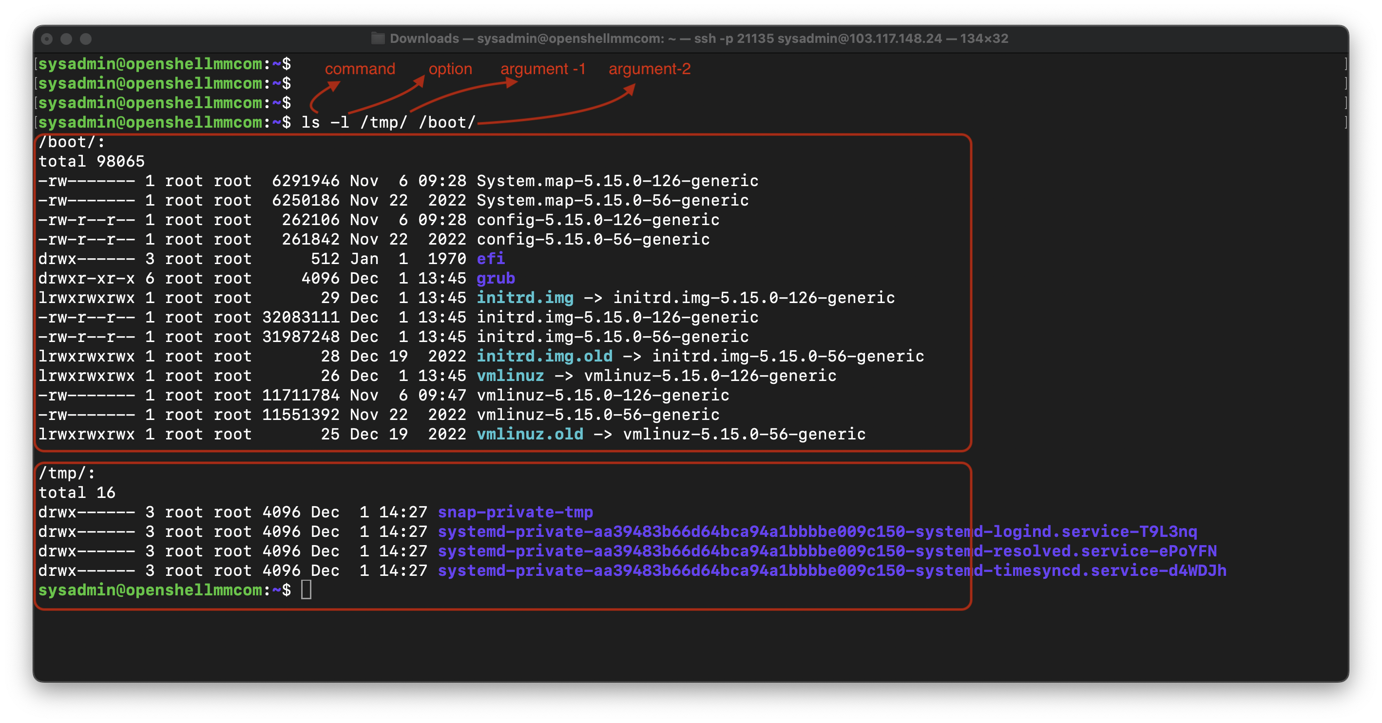/tmp/directory ထဲမှာ ရှိတဲ့ contents တွေကို list ပြုလုပ်ချင်တဲ့ဆိုရင်တော့lscommand ရဲ့ နောက်မှာ ကျွန်တော့်တို့ list လုပ်ချင်တဲ့/tmp/directory လမ်းကြောင်းကို argument အနေနဲ့ ထည့်ပေးရမှာ ဖြစ်ပါတယ်။ - ထပ်ပီးတော့ ကြည့်ကြည့်မယ်ဆိုရင် argument ကို option တွေရဲ့ နောက်မှာ ထားနိုင်သလို option တွေရဲ့ ရှေ့မှာလည်း ထားလို့ ရတာကို တွေ့ရမှာ ဖြစ်ပါတယ်။