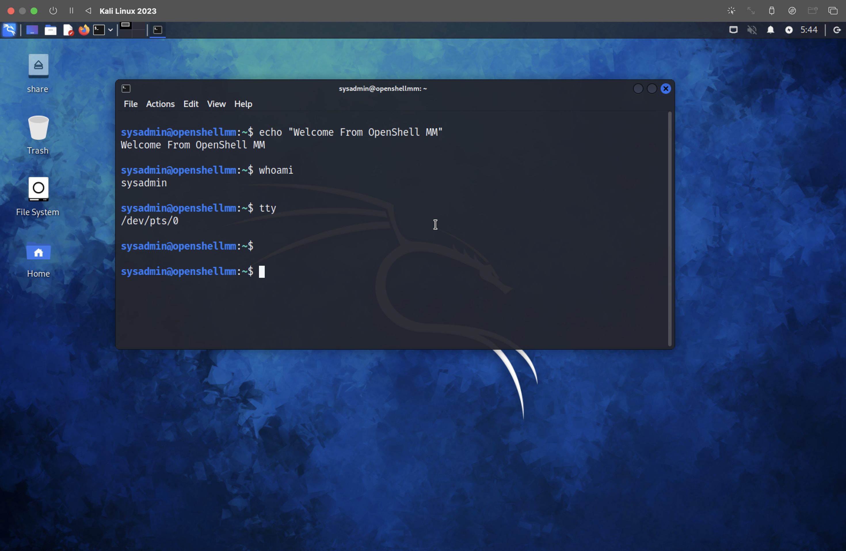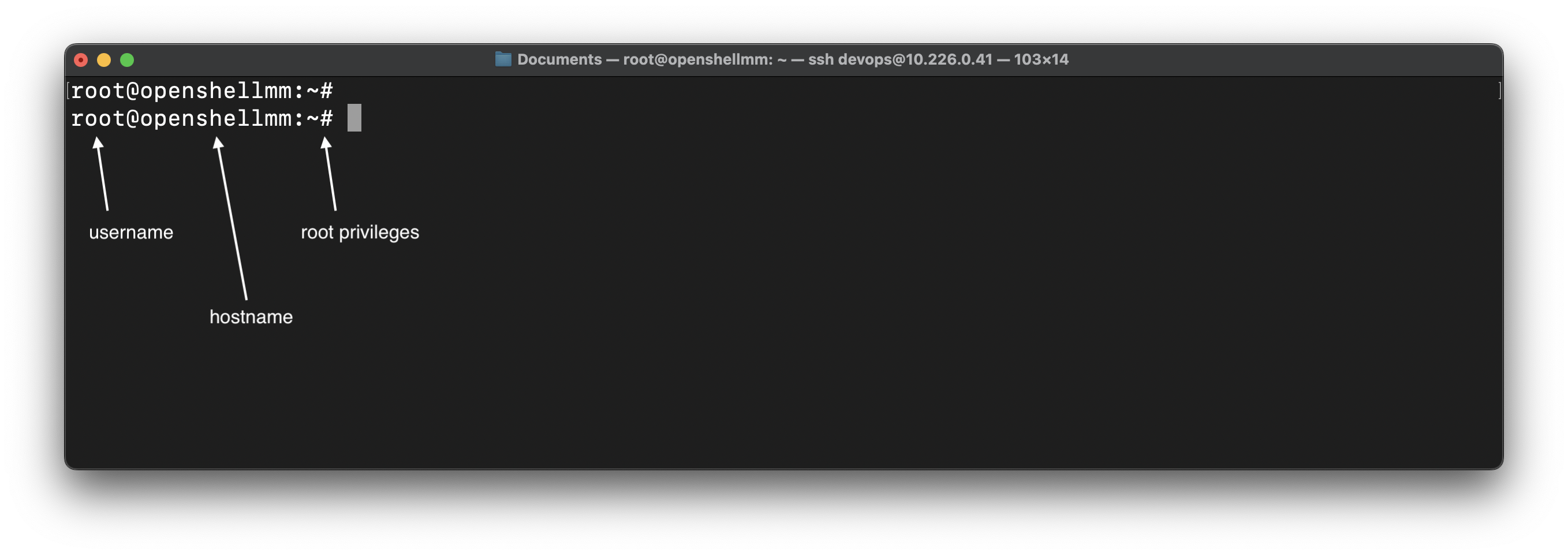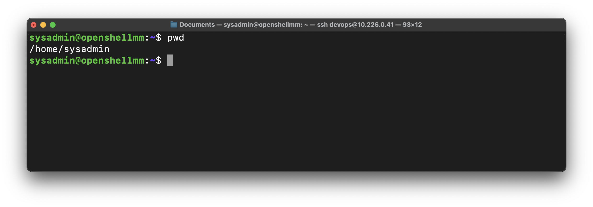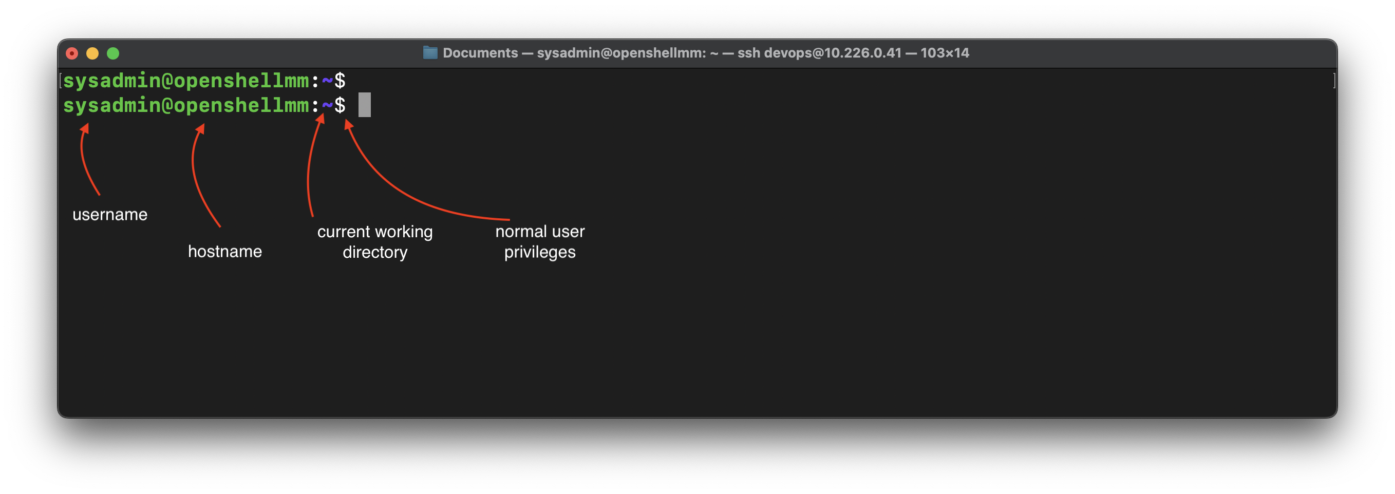 sysadminဆိုတာသည်terminalကို အသုံးပြုနေတဲ့ current login username ဖြစ်ပါတယ်။ @ရဲ့ နောက်ကopenshellmmသည် computer name ဖြစ်ပါတယ်။ တစ်နည်းအားဖြင့်hostnameလို့လည်း ခေါ်ပါတယ်။Hostnameရဲ့ နောက်မှာ:colon လေးခြားပြီး ဖော်ပြထားတာသည် အခု လက်ရှိရောက်နေတဲ့current working directoryကို ပြောတာဖြစ်ပါတယ်။။- Terminal မှာ ကိုယ် လက်ရှိရောက်တဲ့နေရာကို