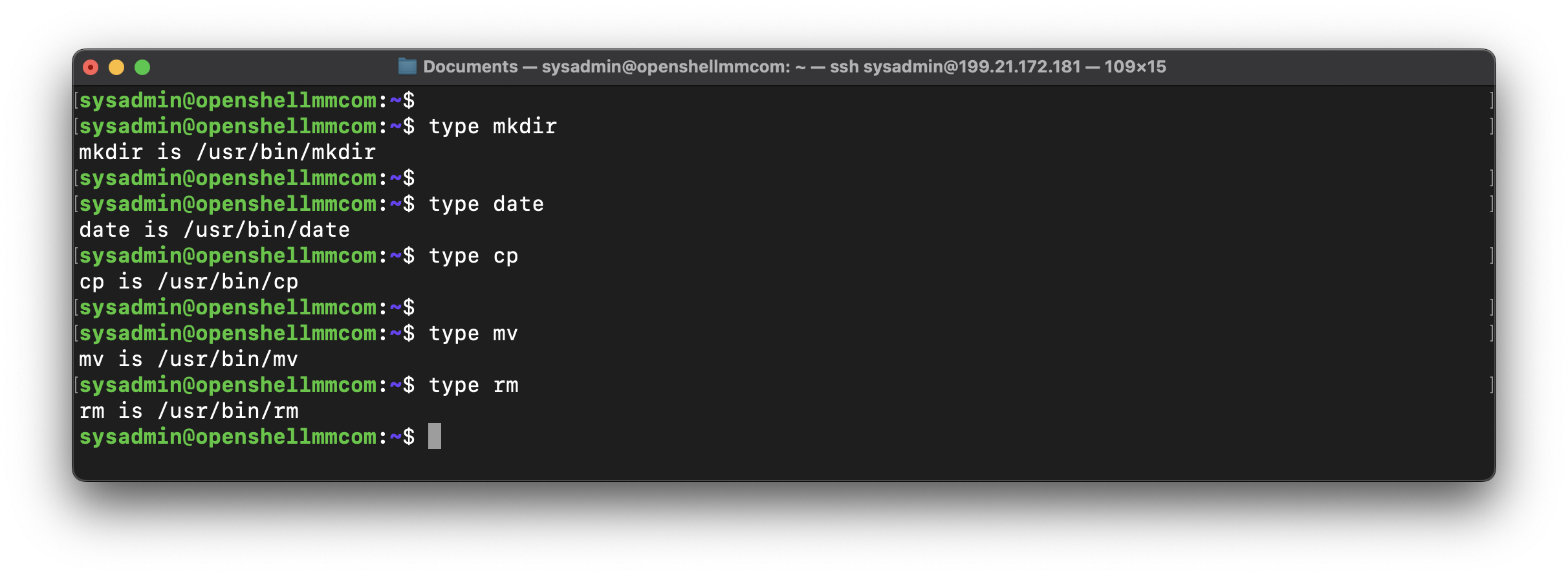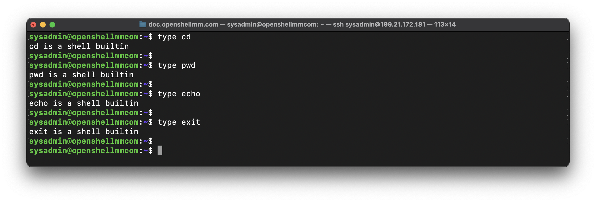 • type command ကို အသုံးပြုပြီး command အမျိုးအစားတွေကို စစ်ကြည့်နိုင်ပါတယ်။