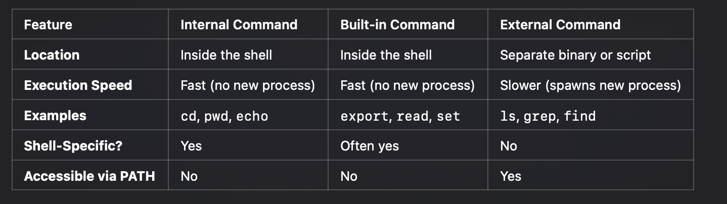 • external commandတွေကို execute ပြုလုပ်တဲ့အခါမှာ shell သည် file system paths တွေ မှာ ရှာဖွေ ပြီး new process တစ်ခုအနေနဲ့ execute ပြုလုပ်ပေးရတာ ဖြစ်တဲ့အတွက်ကြောင့် shell buit-in command တွေထက် execute ပြုလုပ်ရမှာ အနည်းငယ် နှေးပါတယ်။
