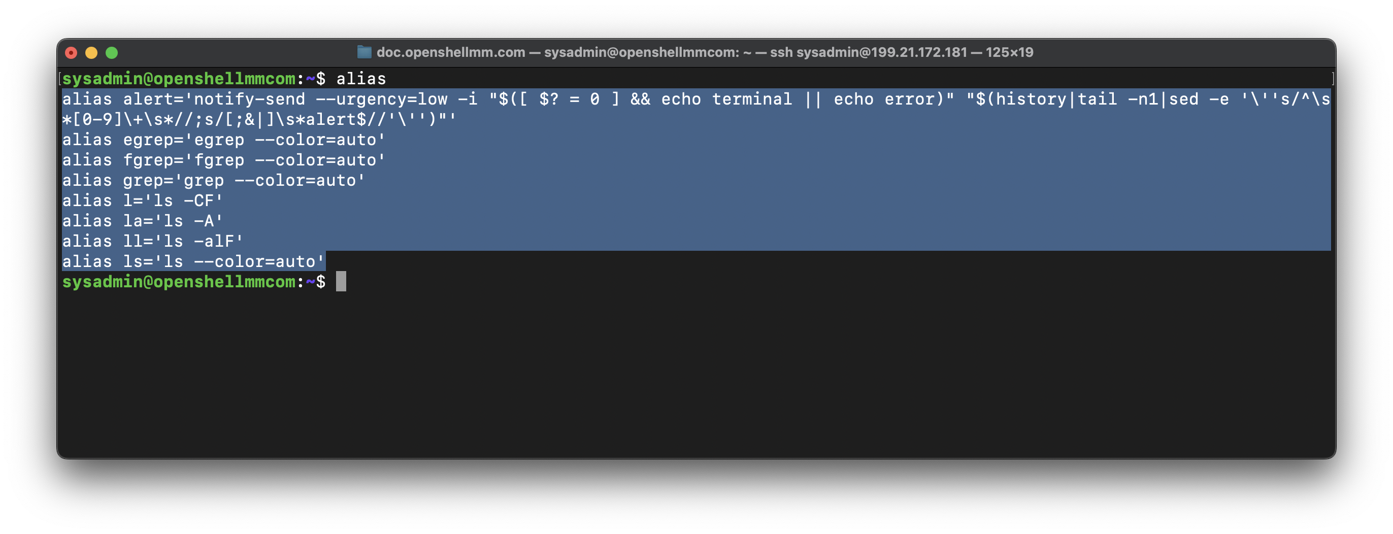 alias command ဆိုတာ command တစ်ခုကို အသုံးပြုရ လွယ်ကူစေ အောင် shortcut command တစ်ခု အနေနဲ့ သတ်မှတ် တာ ဖြစ်တယ်။ ကိုယ့် linux os မှာ သတ်မှတ်ထားတဲ့alias command တွေကို သိလိုတဲ့ အခါ alias command ကို အသုံးပြုပြီး ကြည့် နိုင်ပါတယ်။
