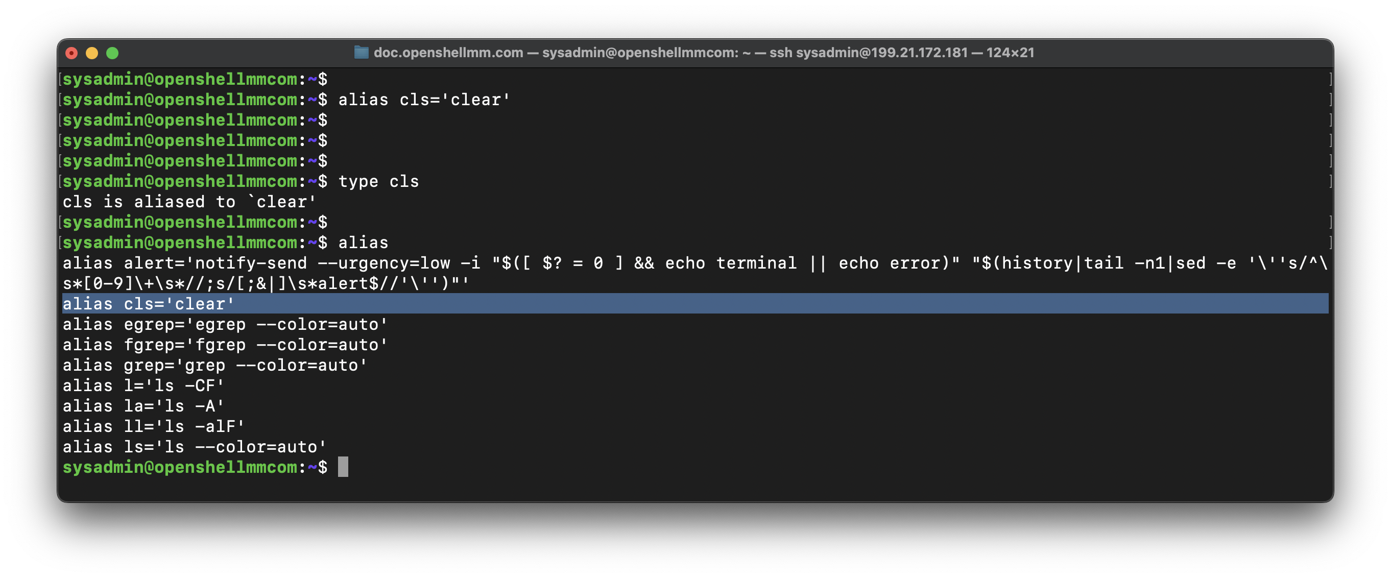 • alias cls='clear' command ကို အသုံးပြုပြီး သတ်မှတ်ကြည့်ပါမယ်။